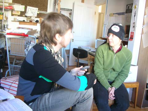 すぐにモントリオールの新聞社「HOUR」の記者である、オリベールが到着。僕のウェブサイトをよく見てくれていて、たくさんの質問を浴びる。パソコンで説明しながら、熱く話す。一時間ほど話した。彼も色々と興味があり、取材ではあるが、いい議論が出来たのではないか。こういう説明の時になると、僕の英語はなぜか突然気合が入る。